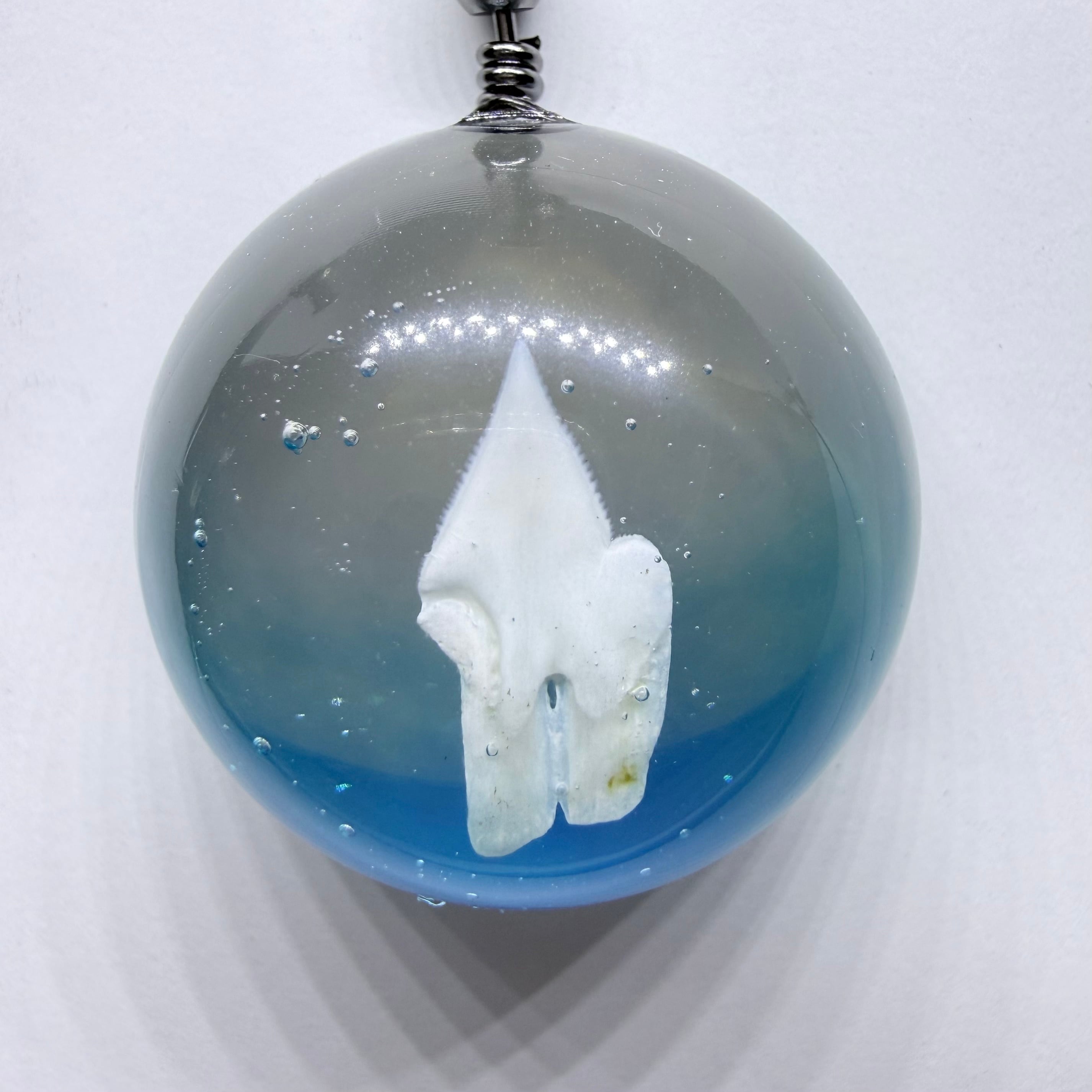 レジンの中に深海ザメの歯を埋め込んだストラップになります。