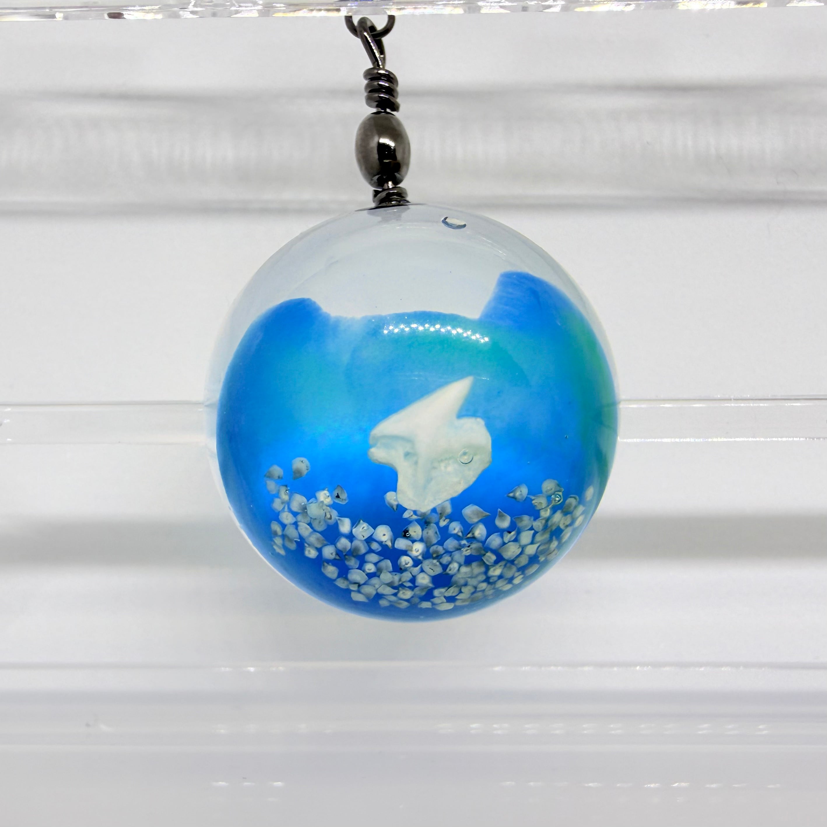 レジンの中に深海ザメの歯を埋め込んだストラップになります。