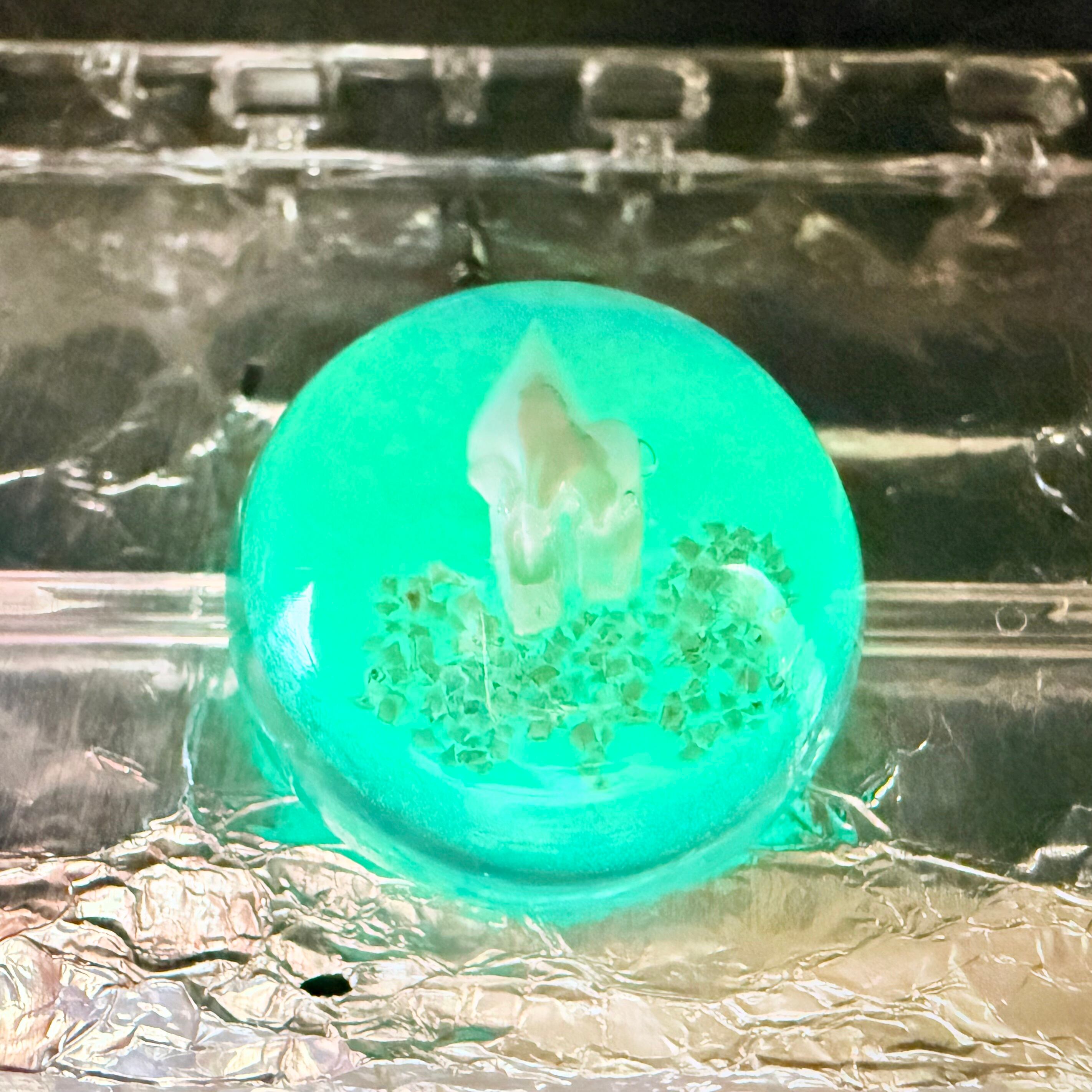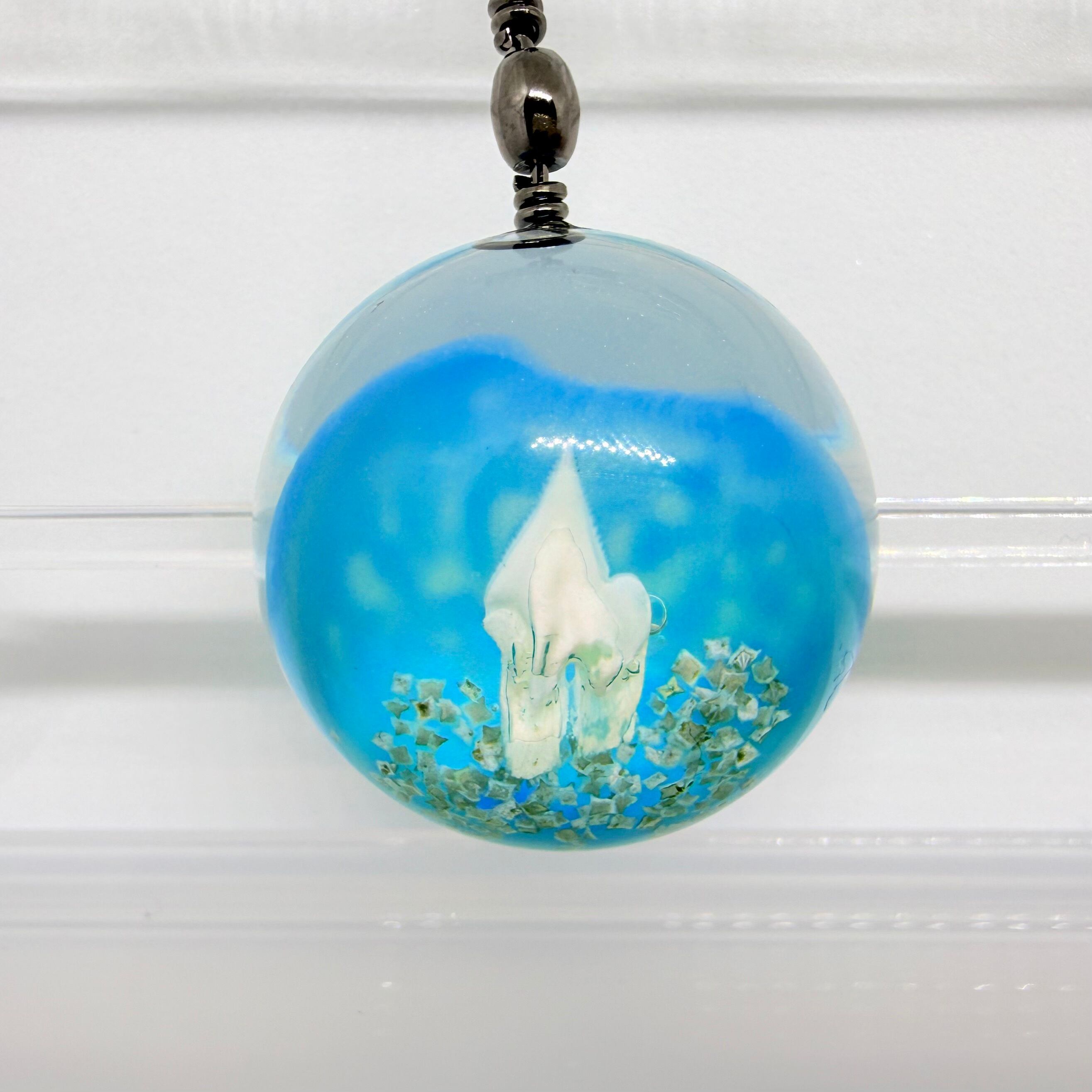 レジンの中に深海ザメの歯を埋め込んだストラップになります。