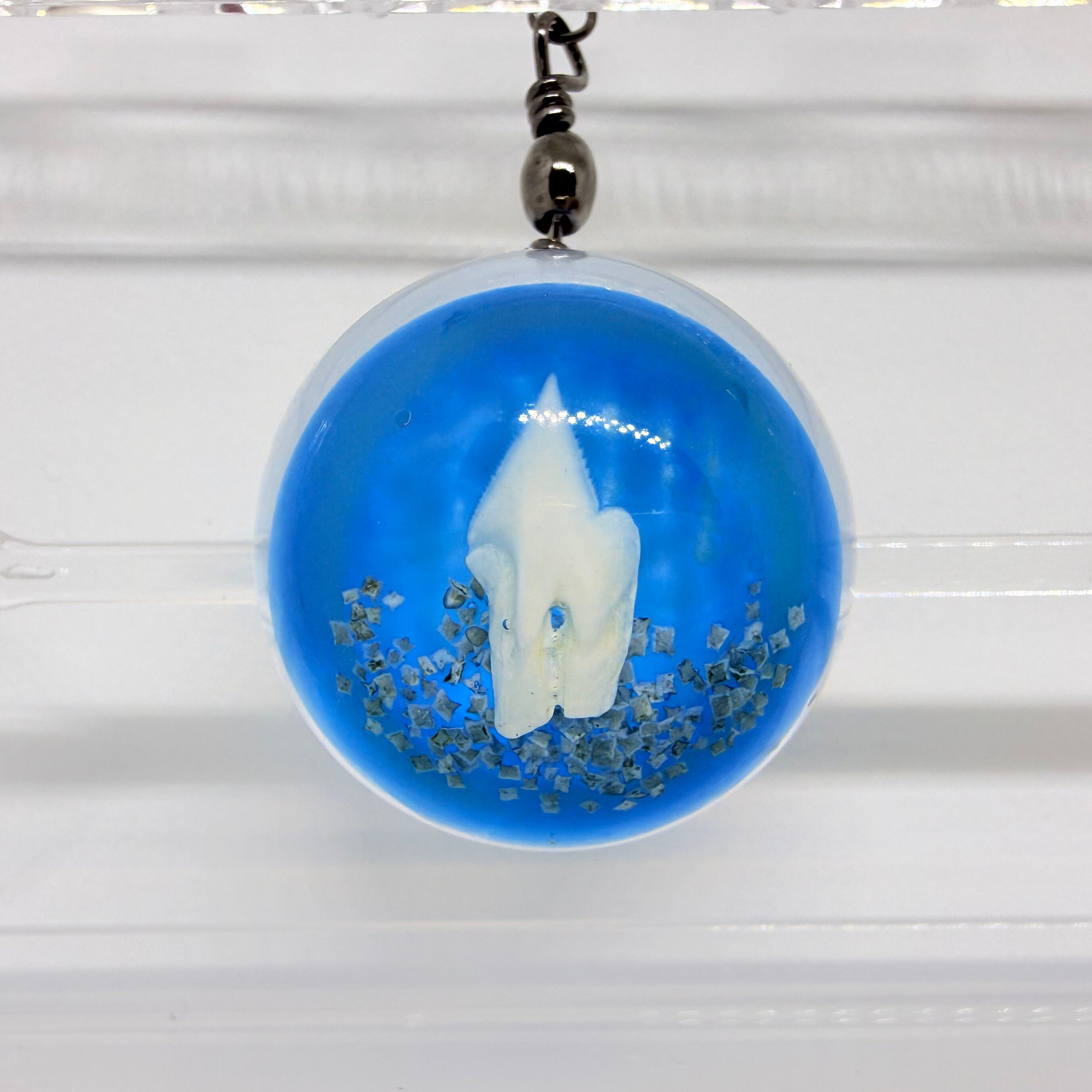 レジンの中に深海ザメの歯を埋め込んだストラップになります。