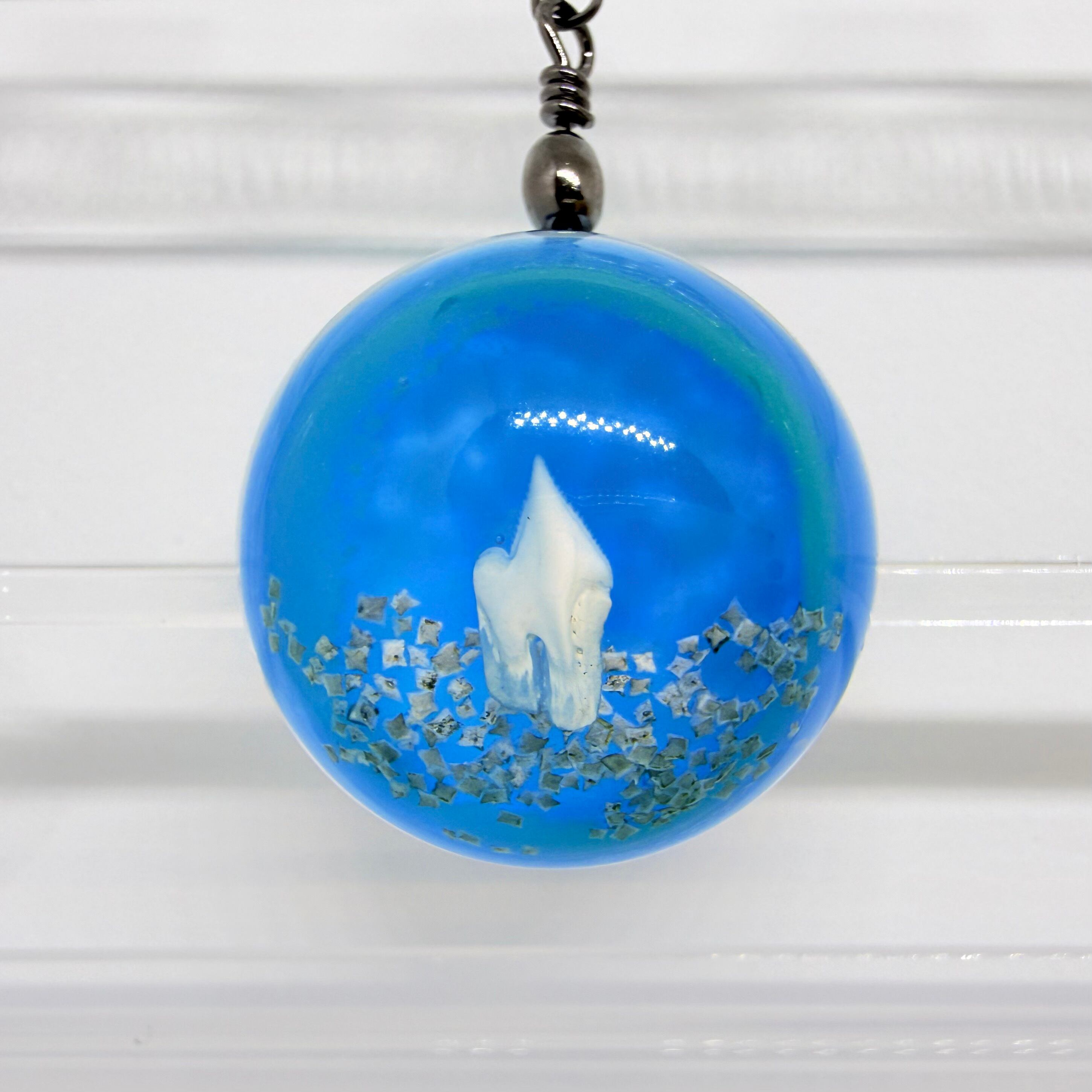 レジンの中に深海ザメの歯を埋め込んだストラップになります。