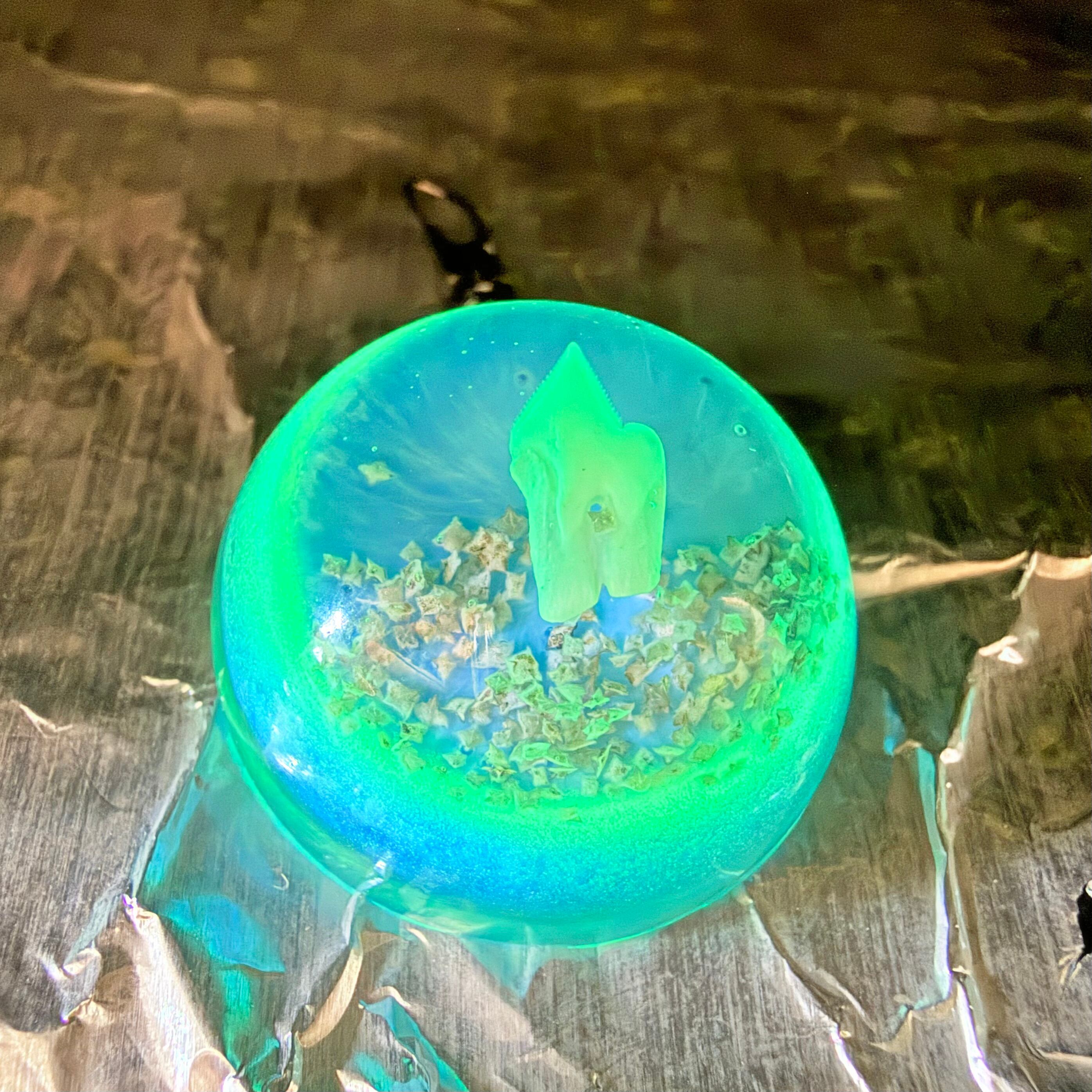 レジンの中に深海ザメの歯を埋め込んだストラップになります。