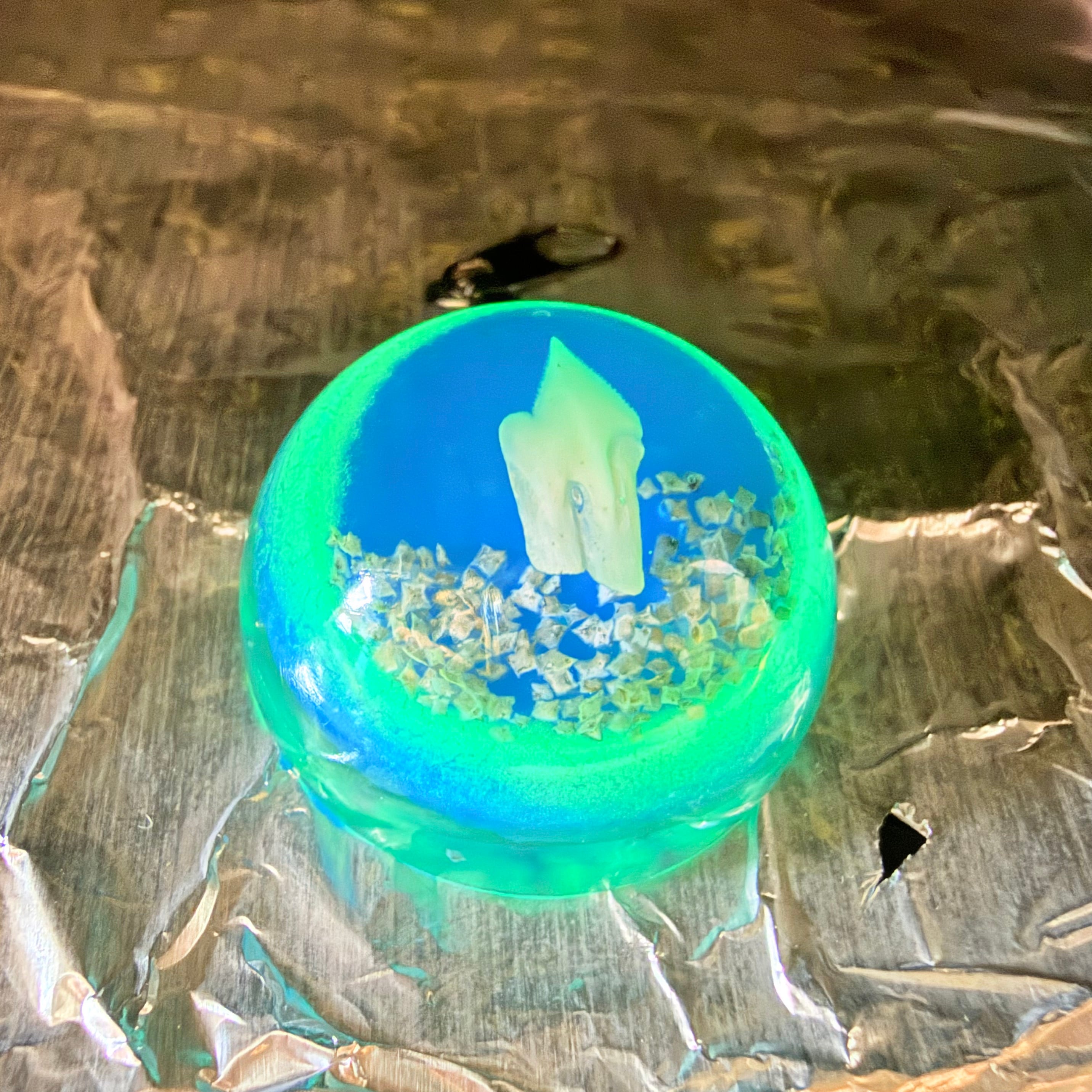 レジンの中に深海ザメの歯を埋め込んだストラップになります。
