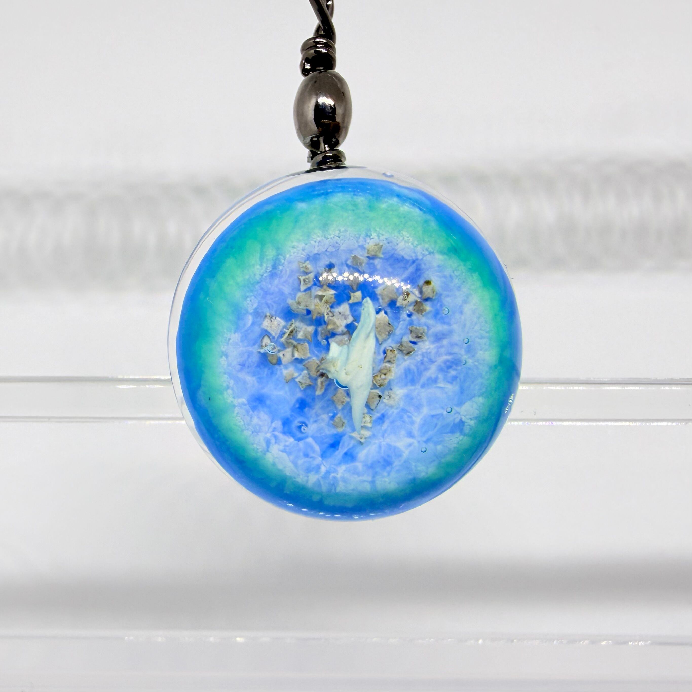 レジンの中に深海ザメの歯を埋め込んだストラップになります。