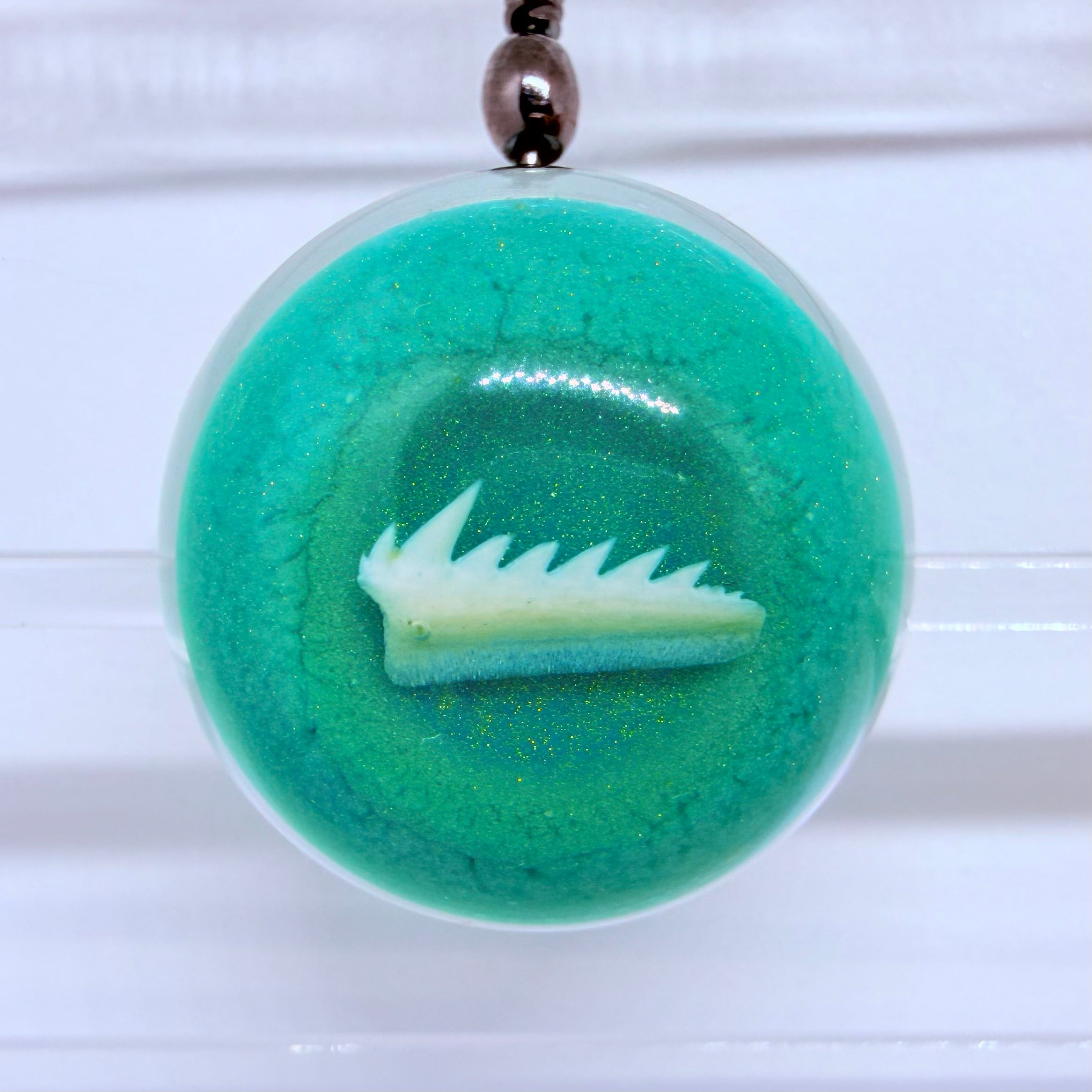 レジンの中に深海ザメの歯を埋め込んだストラップになります。