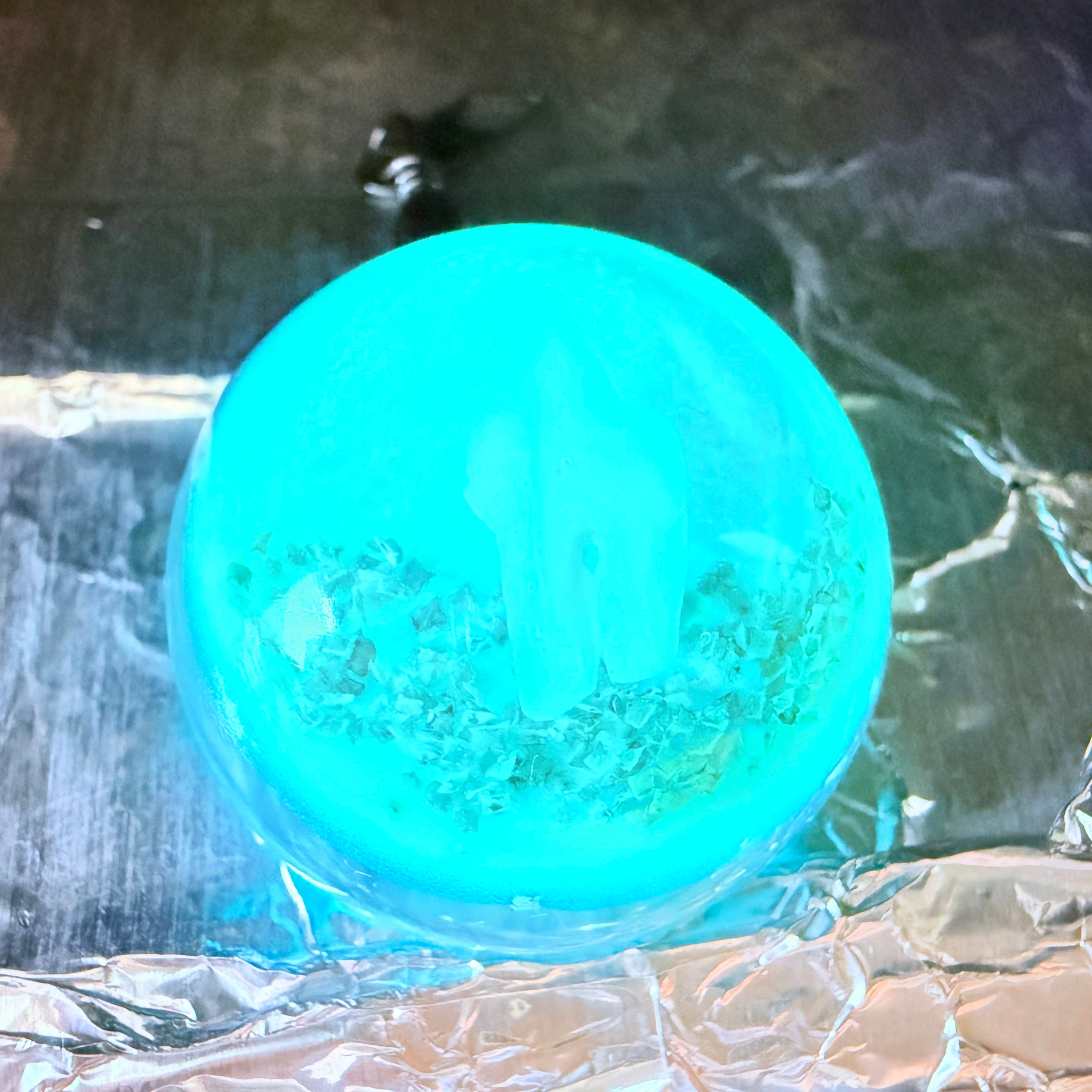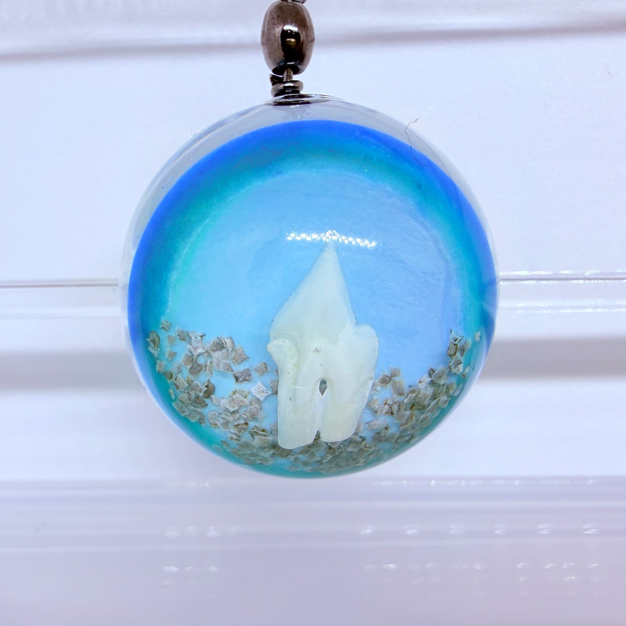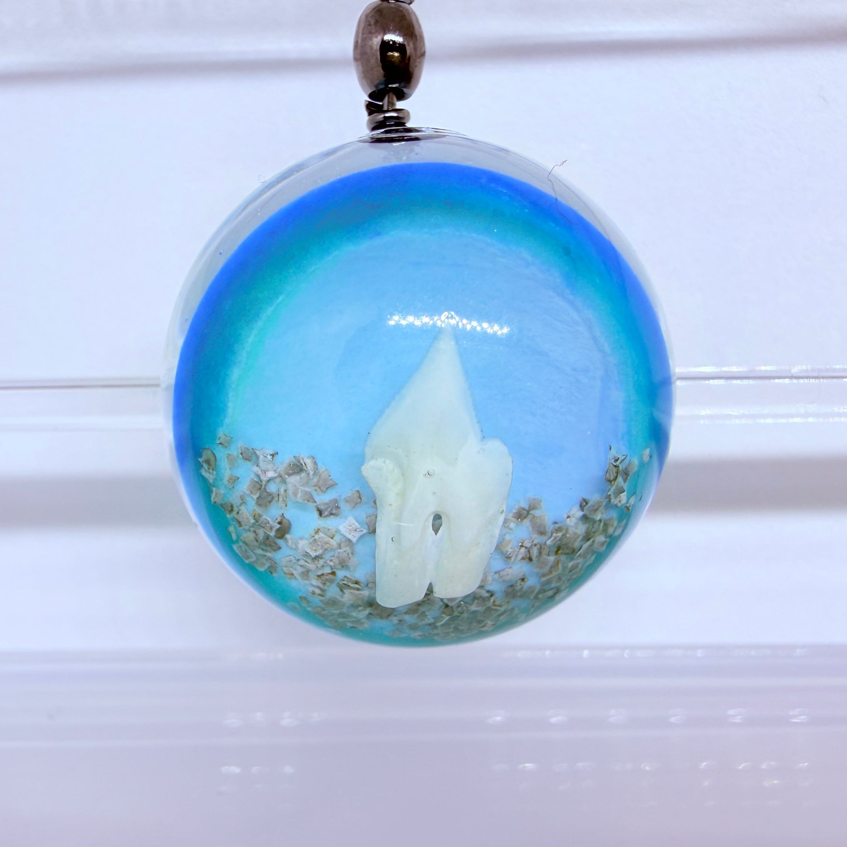 レジンの中に深海ザメの歯を埋め込んだストラップになります。