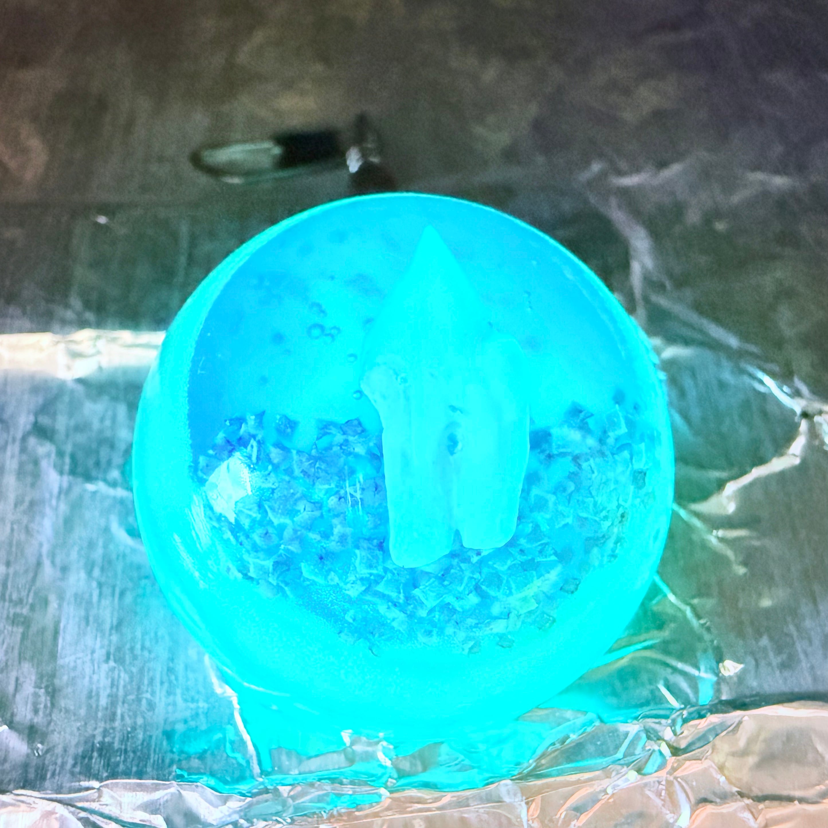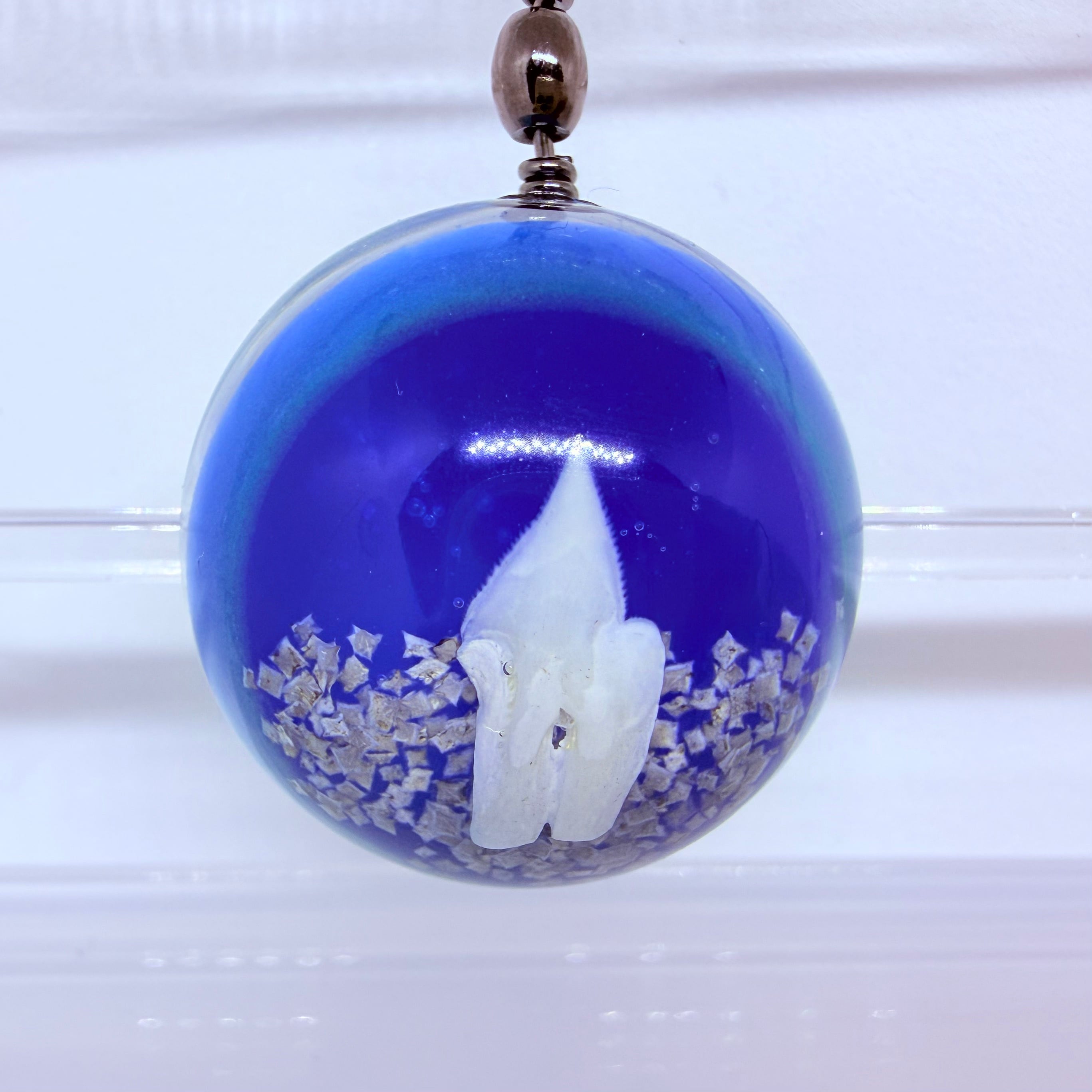 レジンの中に深海ザメの歯を埋め込んだストラップになります。
