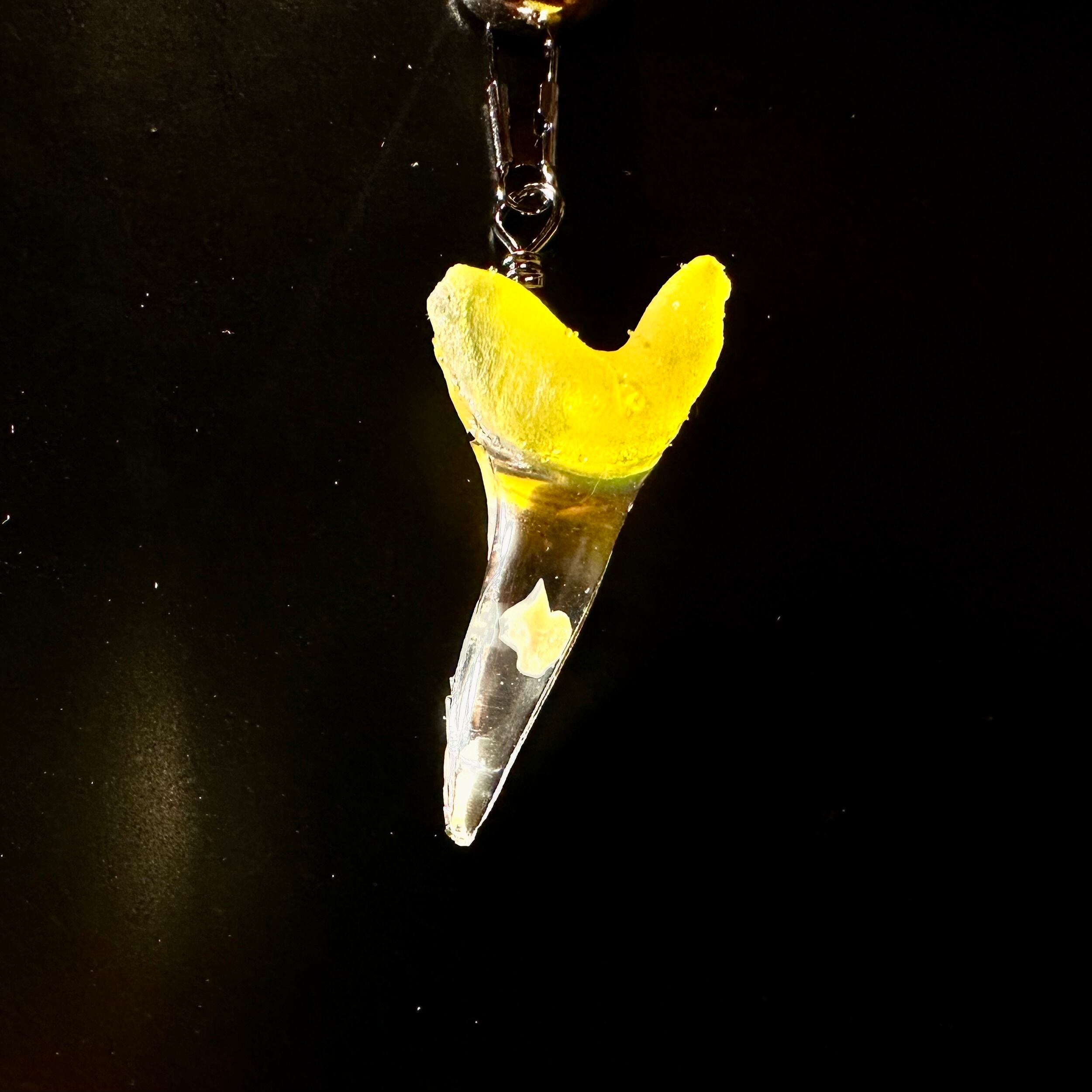 レジンの中に深海ザメの歯を埋め込んだストラップになります。